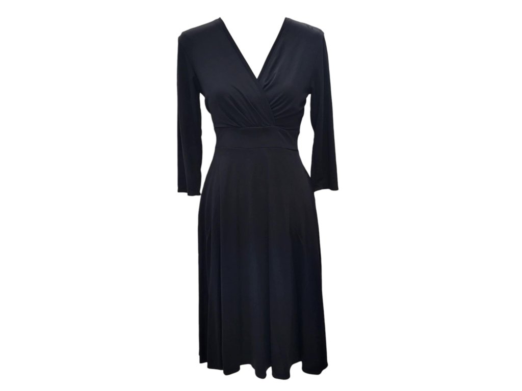 Velmi ženský střih je u těchto šatů podtržený kříženým výstřihem.