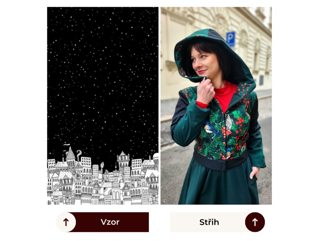 s autorským printem a provedením s vyšším límcem a kapucí.
