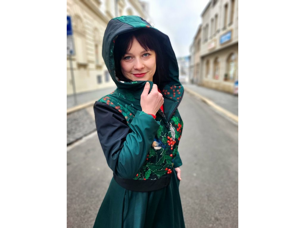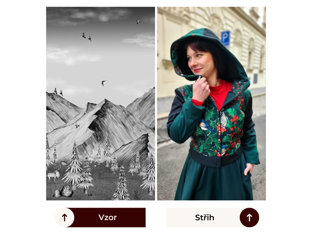 s autorským printem a provedením s vyšším límcem a kapucí.