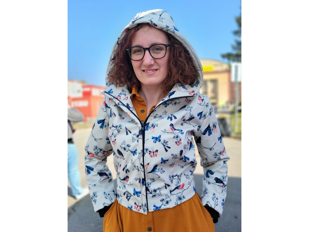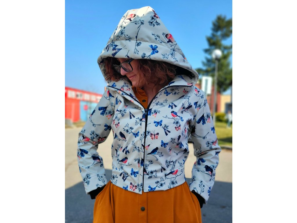s autorským printem a provedením s vyšším límcem a kapucí.