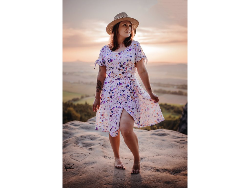 Šaty volnějšího střihu se zavinutou sukní a vázáním na rukávu