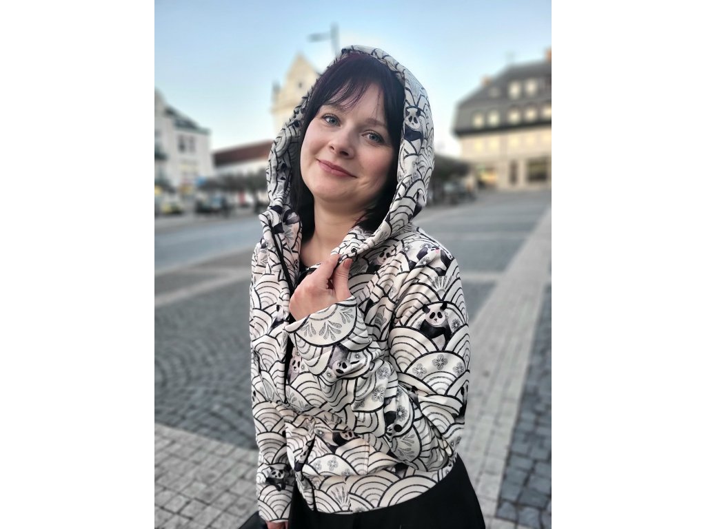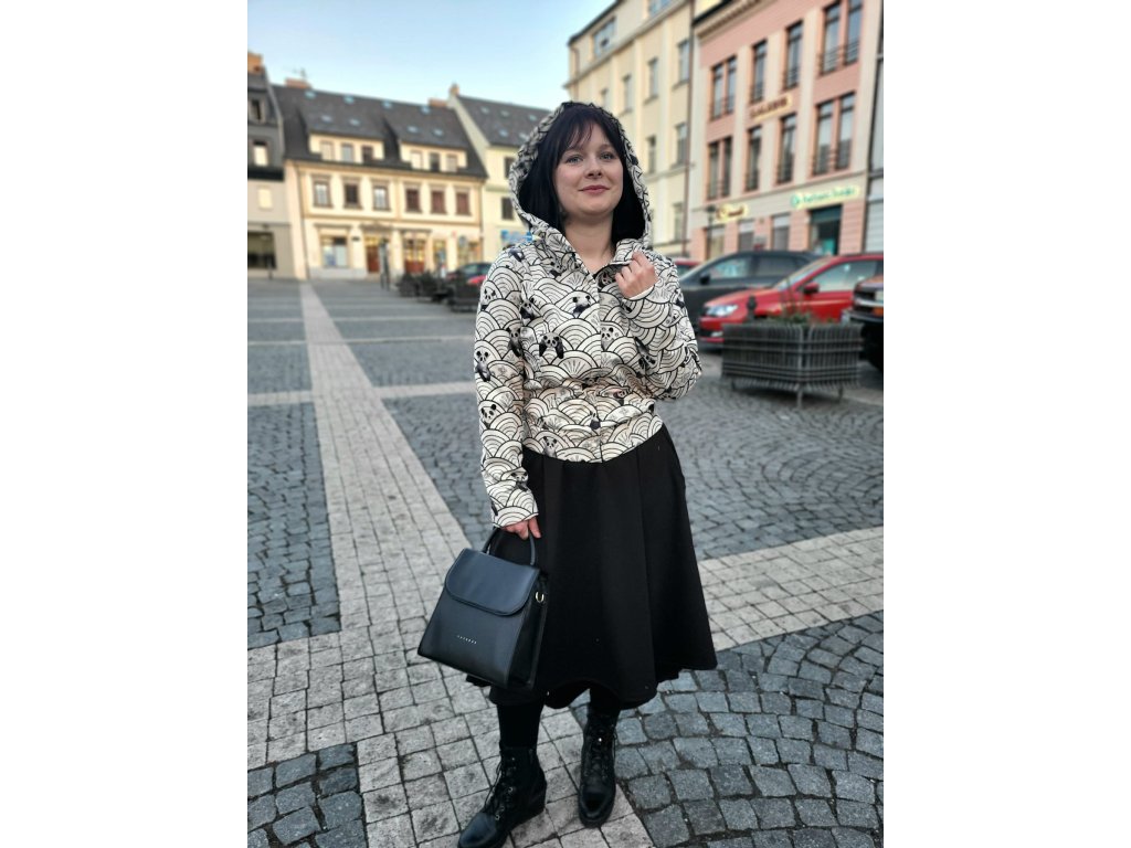 s autorským printem a provedením s vyšším límcem a kapucí.
