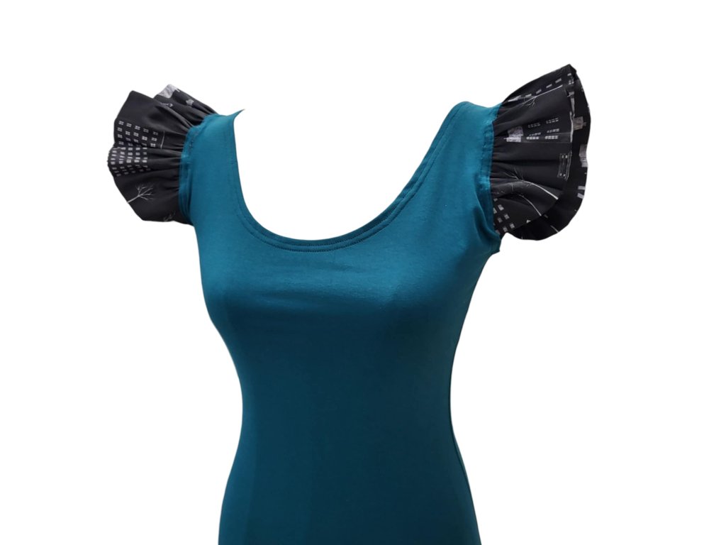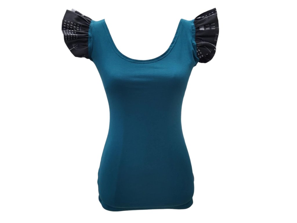 Rozverné a extravagantní tričko zdobené řaseným volánkovým rukávem