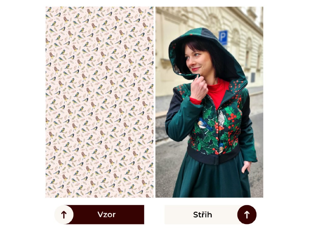 s autorským printem a provedením s vyšším límcem a kapucí.