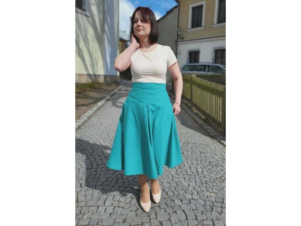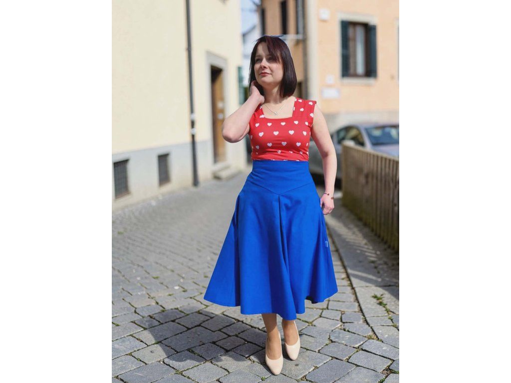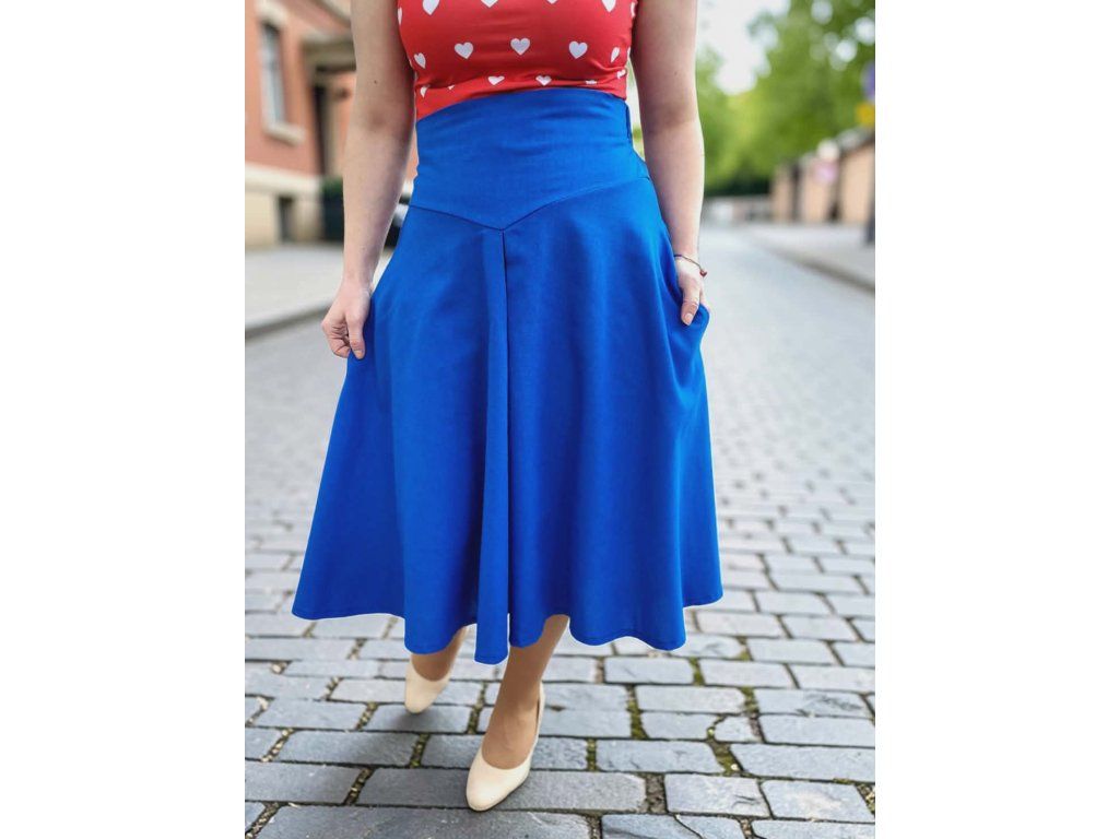 Katty je nevšední půlkolová sukně s výrazným vysokým pasem,